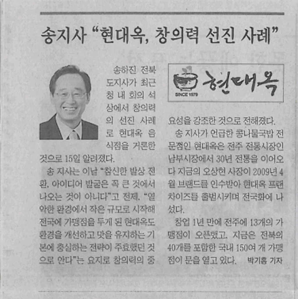 멀리 있는 것이 아니다.현대옥의 경우를 보면 재래시장속에 있던 유명 콩나물국밥집을 환경 개선하고 위생을 강화한