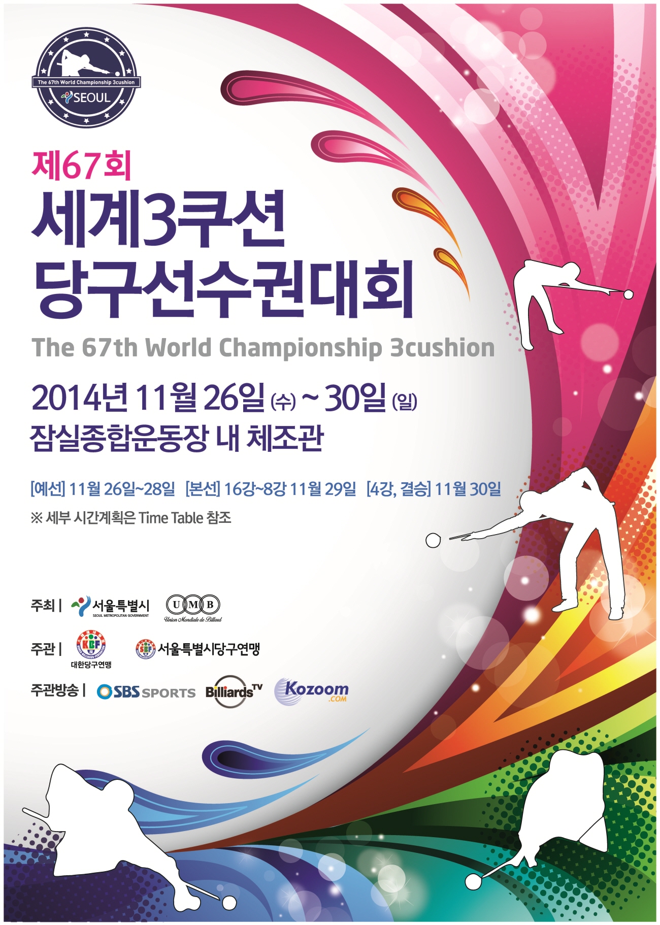 조관에서 개최됩니다. 전세계 약 30여 개국 탑랭커들이 출전하여 '2014년도 3쿠션 최강자'를 가리는 국제 당구대회입니다.