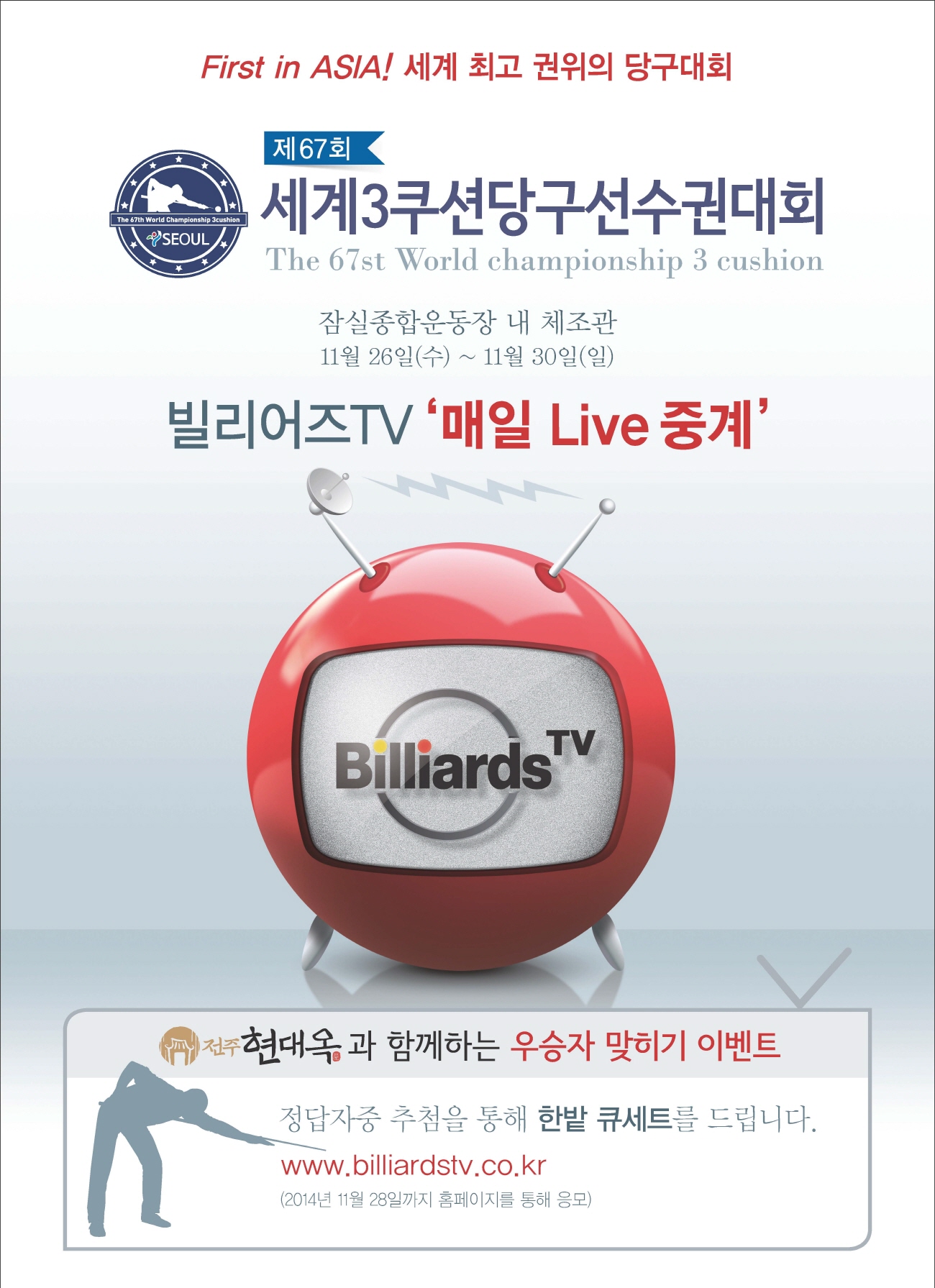 현대옥 타이틀의 이벤트를 고지(11월 18일자 한국경제신문)할 것이며, 이 이벤트는 빌리어즈TV 홈페이지에서도 고지