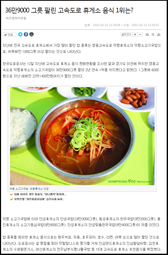 휴게소 음식중 가장 많이 팔리고 있는 음식(1등 덕평휴게소의 덕평소고기국밥, 2등 안성휴게소의 안성국밥)을 발표
